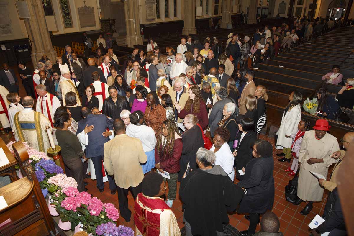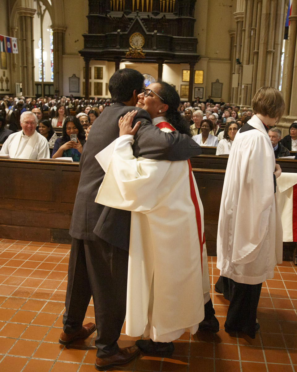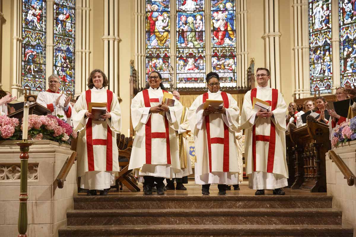 Newly ordained transitional deacons receive applause from the congregation at St. James Cathedral on May 4 during the Ordination to the Sacred Order of Deacons service. From left are the Rev. Tiffany Robinson, the Rev. Rajini Lyman, the Rev. Denise Byard and the Rev. Michael Brain. The service included the examination, consecration and vesting of the new deacons. The Rev. Canon Lisa Newland gave the homily.