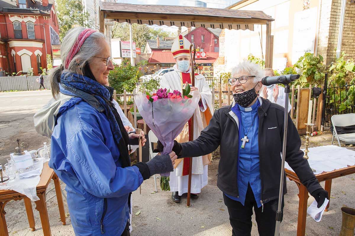 Bishop Andrew Asbil celebrated and preached, and the congregation of 30 included past and present volunteers, donors and board members, as well as people from the wider community. Despite the cold fall temperatures, the service took place outside. “The drop-in was still running, and it meant that we could sing,” says Ms. Falby. “It was very cold, I have to say!”