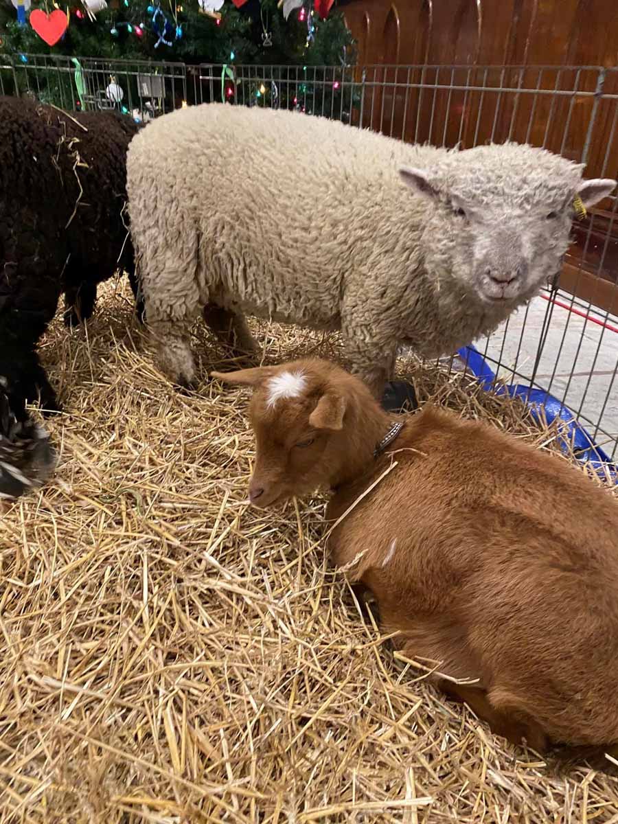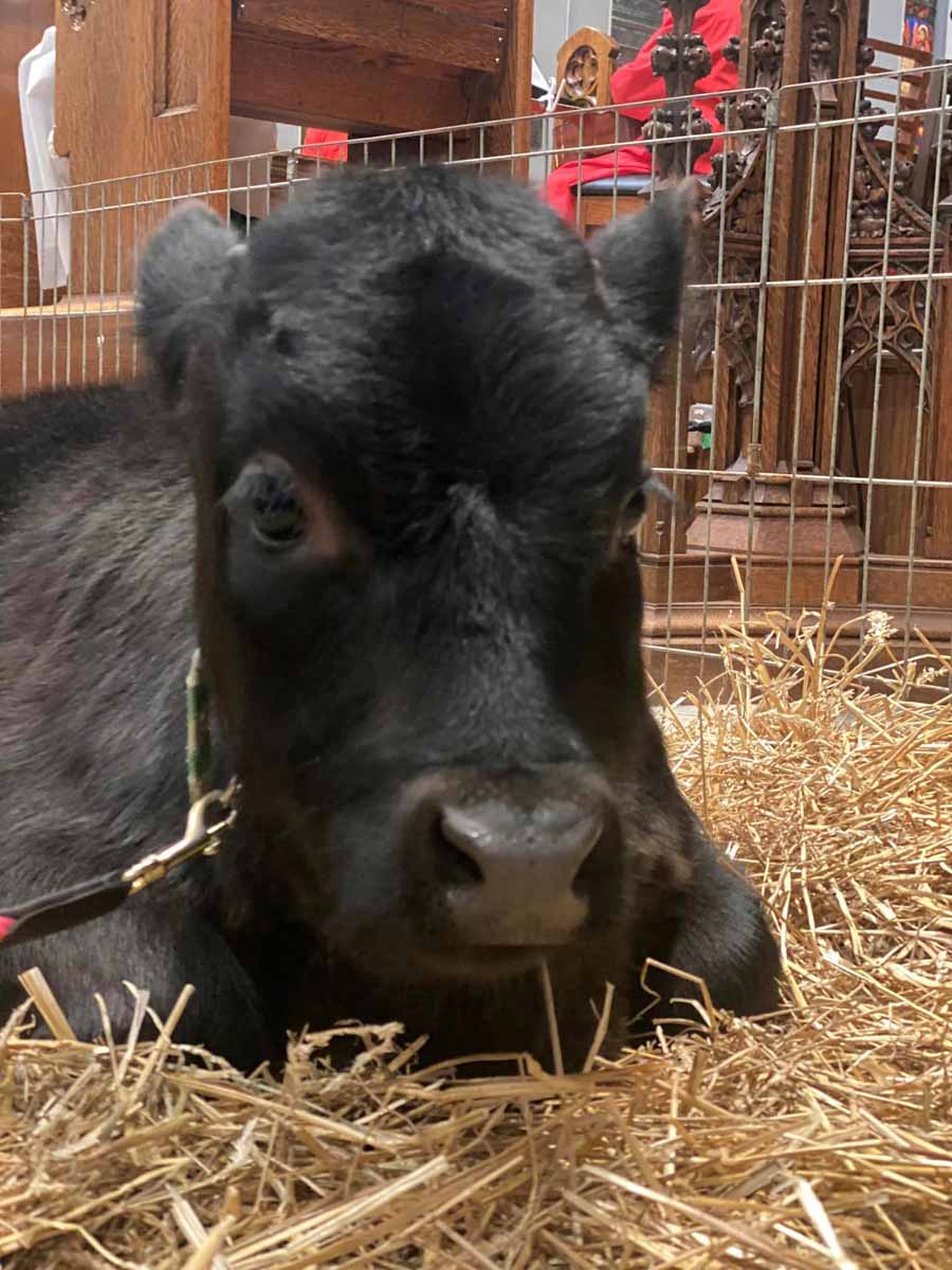 In the place where the grand piano usually sits lay a straw-covered tarpaulin surrounded by a low wire fence. In this enclosure a multitude of farm animals either explored their new home or busied themselves ignoring the throngs of fascinated churchgoers who, like us, approached the beasts with curiosity and amazement.
