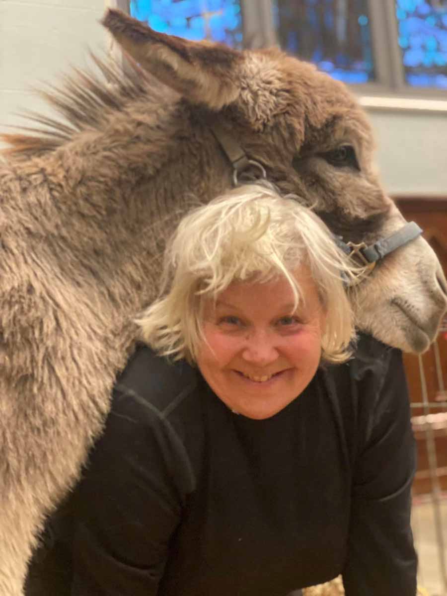 At one pivotal moment, Father Matt left his pulpit and approached the pen. Lifting his robes, he climbed over the barrier. I thought he was going to bless the flock, but he came out with Delilah’s lead in his hand, encouraging her to walk down the aisle toward the back of the church. She was not a willing participant, but she made the best of the situation. A certain irony existed in this stroll. In the bible, we hear of a donkey carrying Mary, who was with child. Apparently Delilah was also pregnant!