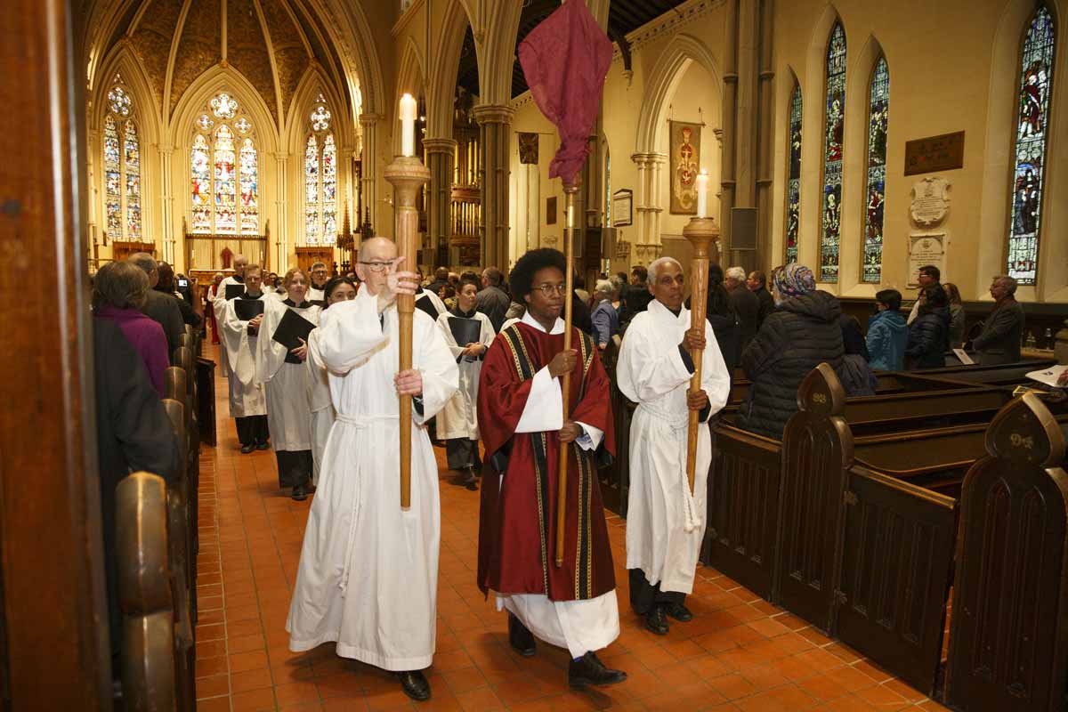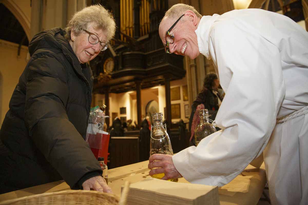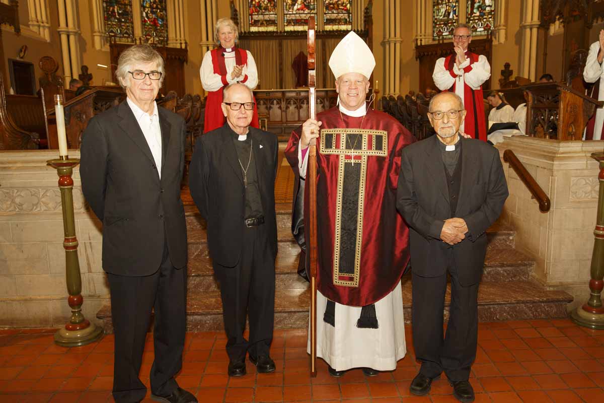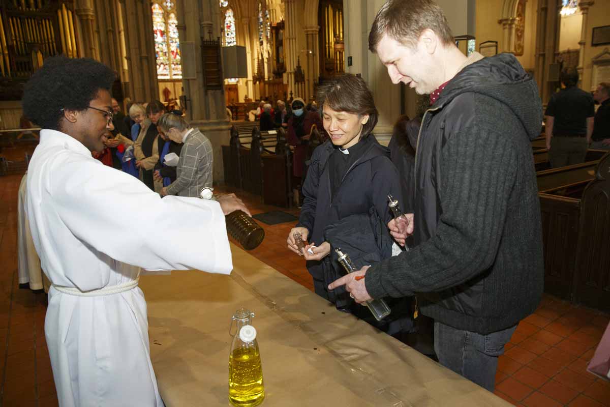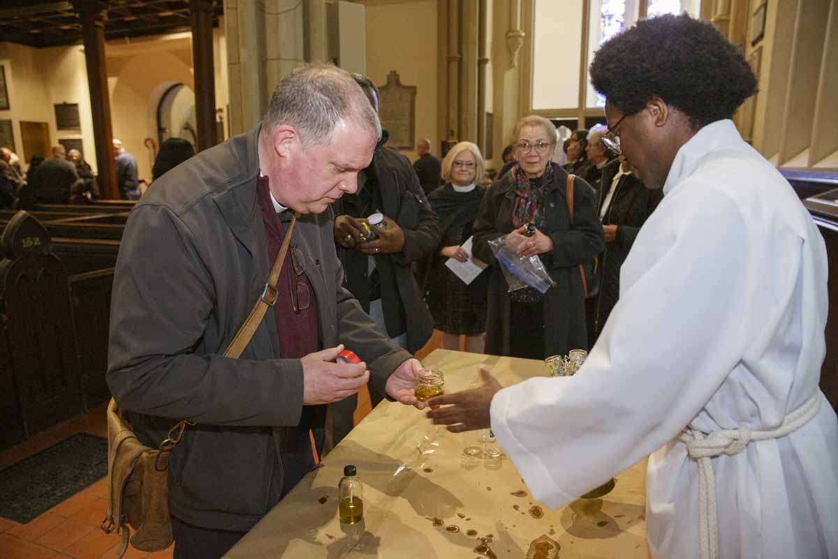 Bishop Andrew Asbil presented stoles to clergy celebrating their 25th and 50th years of ordination to the priesthood at the diocese’s annual Blessing of Oils and the Reaffirmation of Ordination Vows of Bishops, Priests and Deacons service at St. James Cathedral on March 26. After the service, clergy received consecrated oil for anointing and healing. A Ministry of Reconciliation was also offered in the cathedral’s chapel.