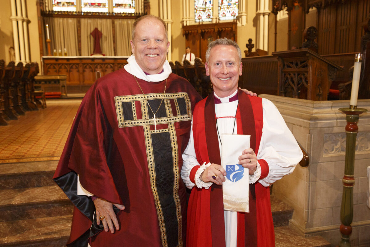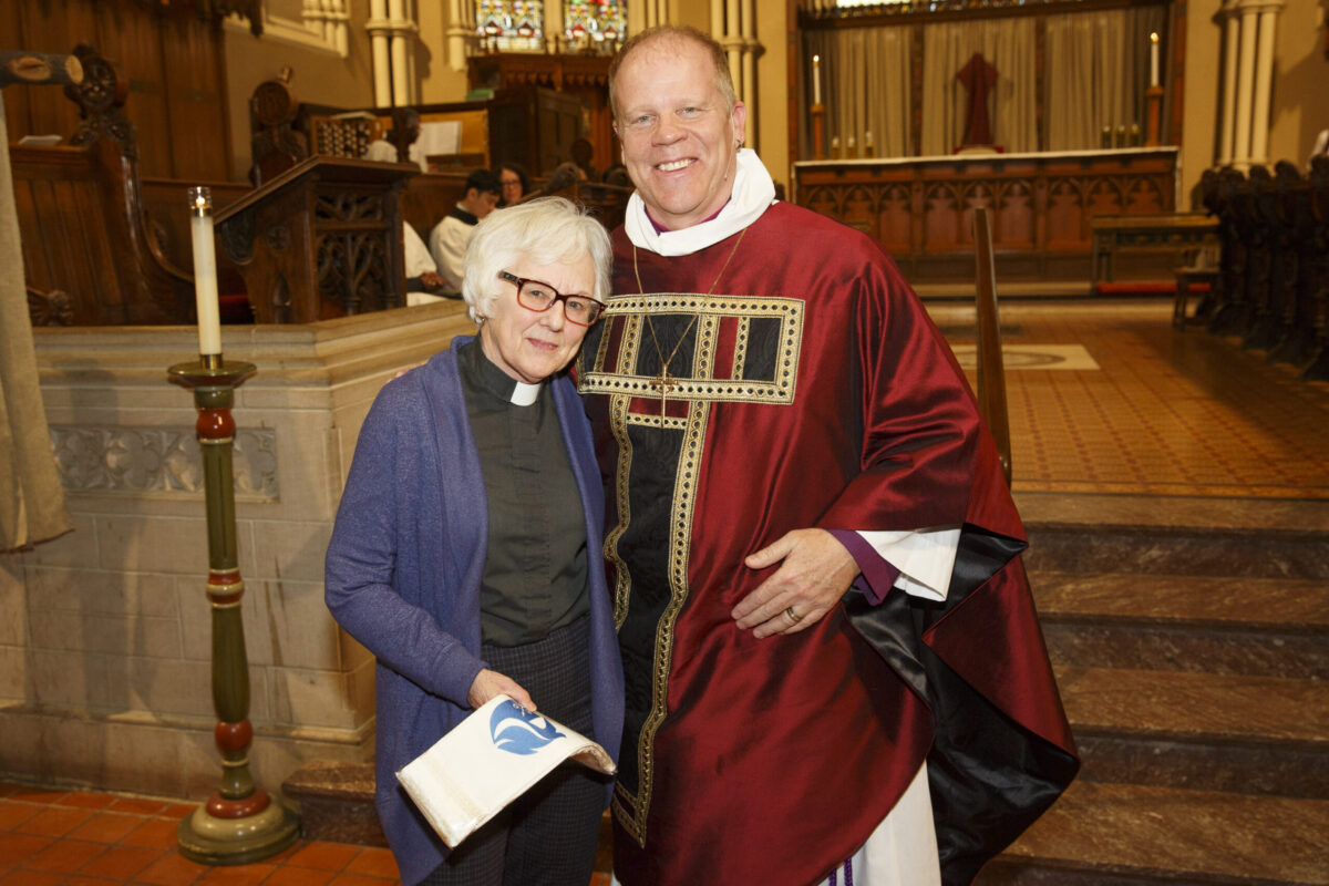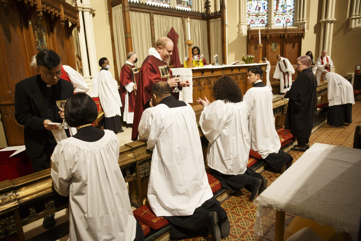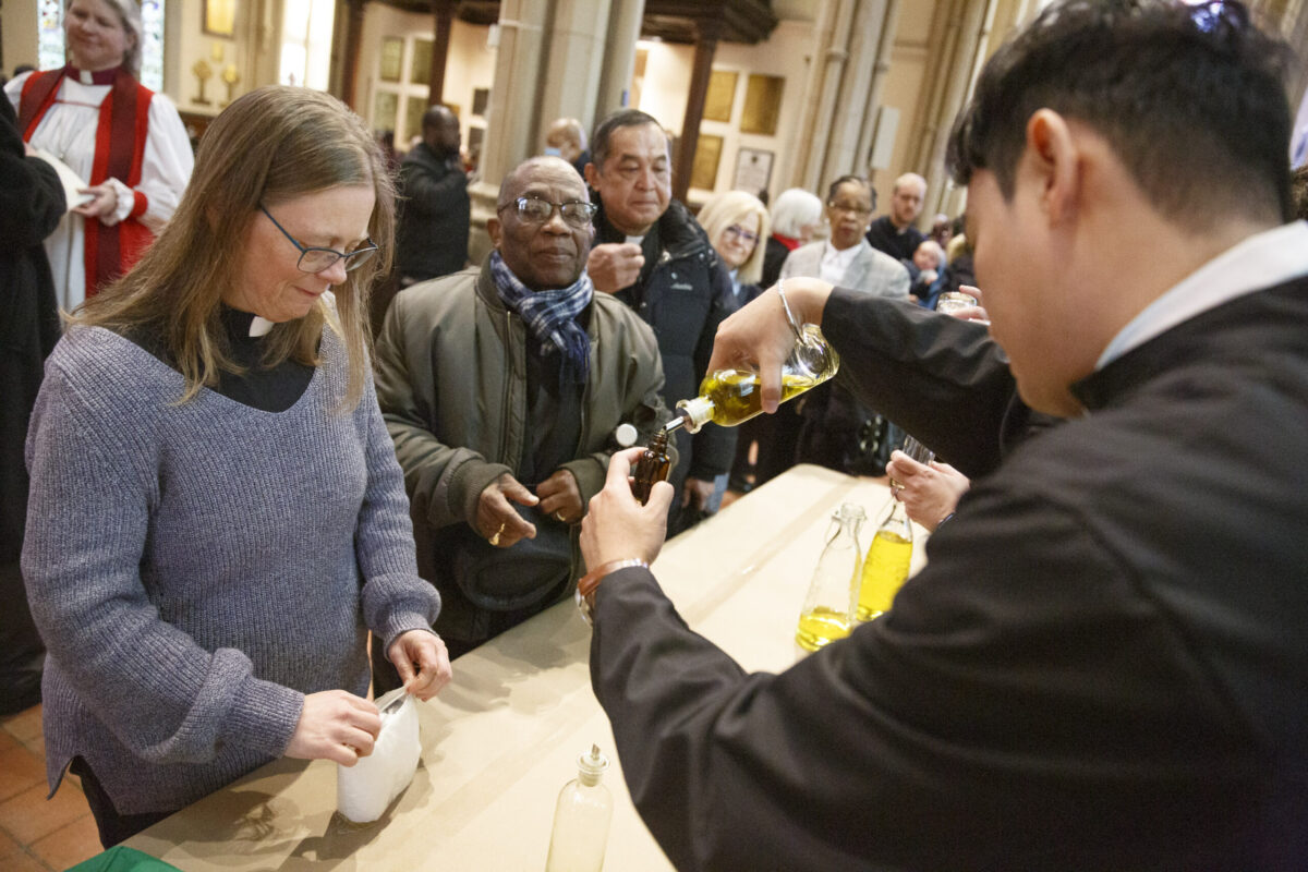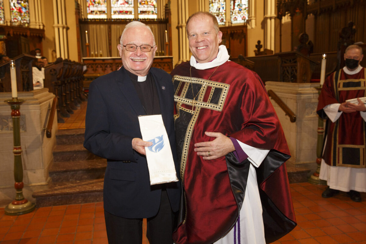 Bishop Andrew Asbil presents stoles to clergy in honour of their 25th and 50th years of ordination to the priesthood at the diocese’s annual Blessing of Oils and the Reaffirmation of Ordination Vows of Bishops, Priests and Deacons service at St. James Cathedral on April 4. After the service, clergy received consecrated oil for anointing and healing