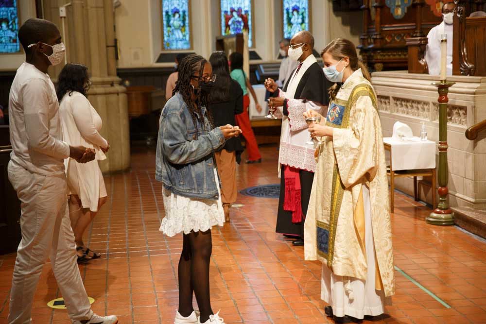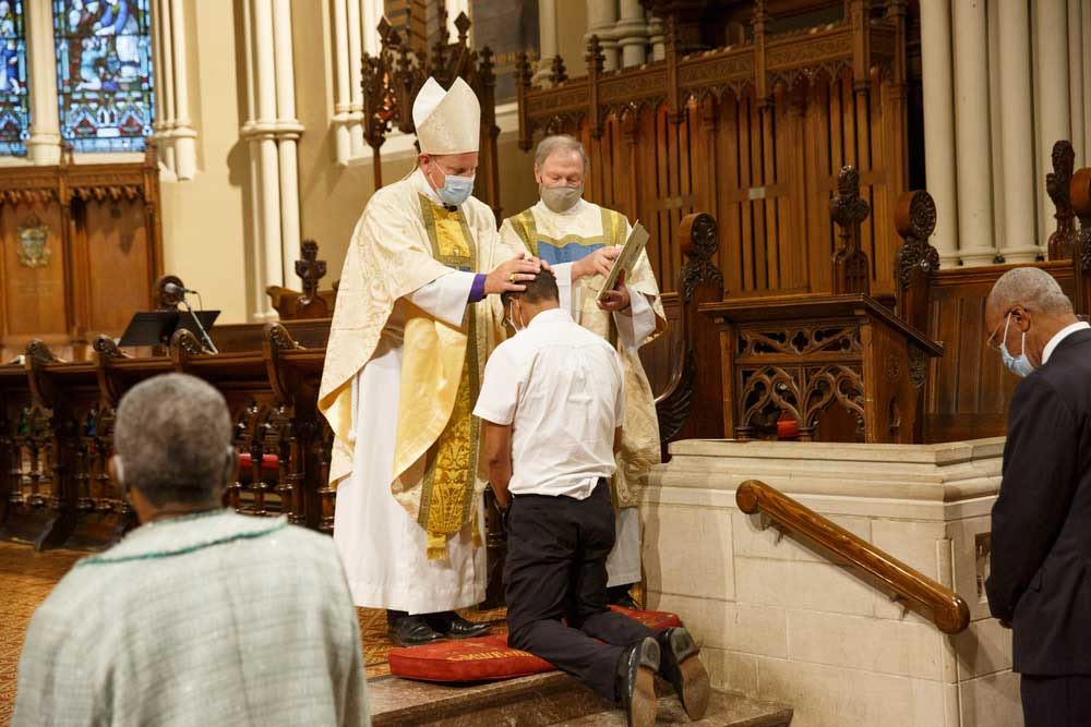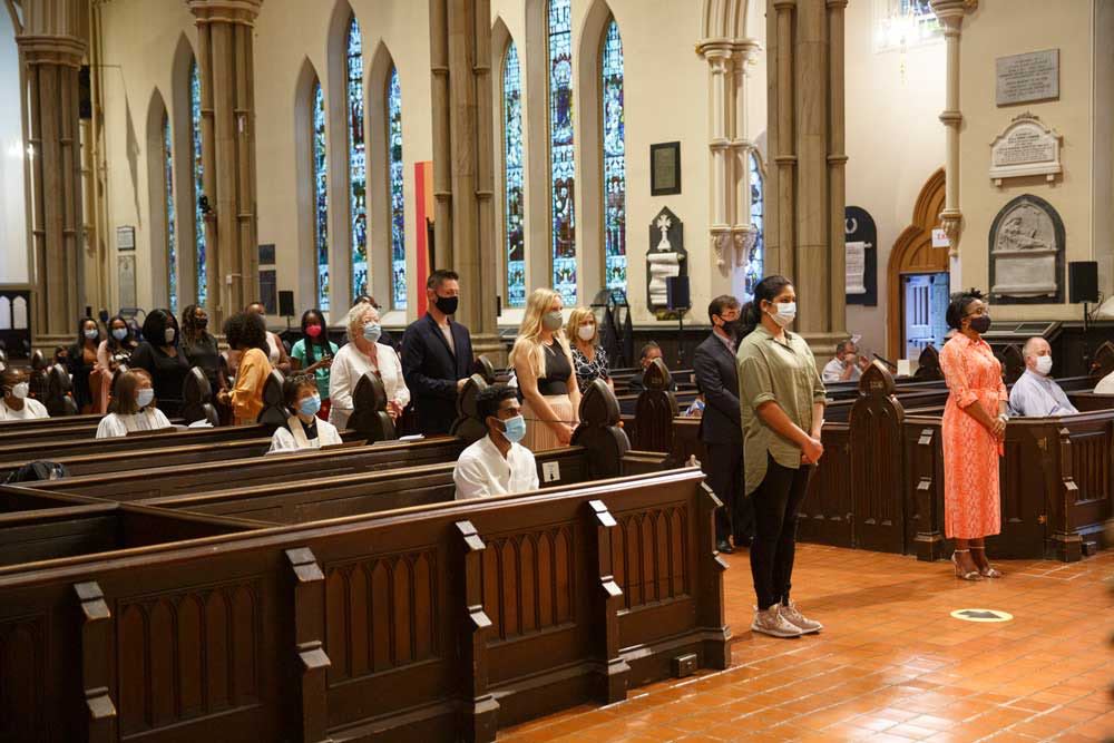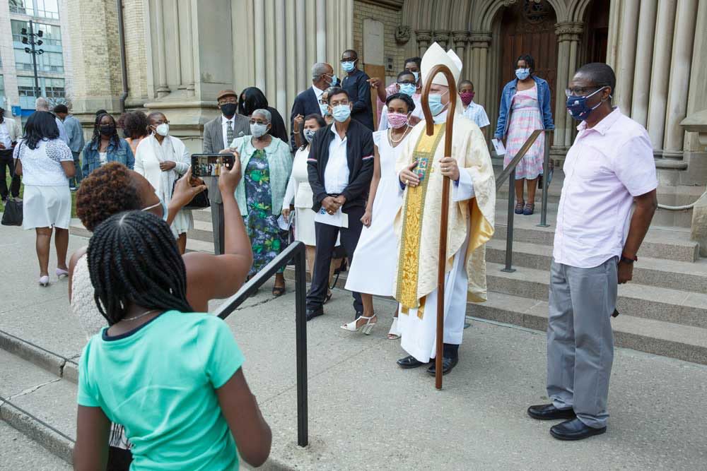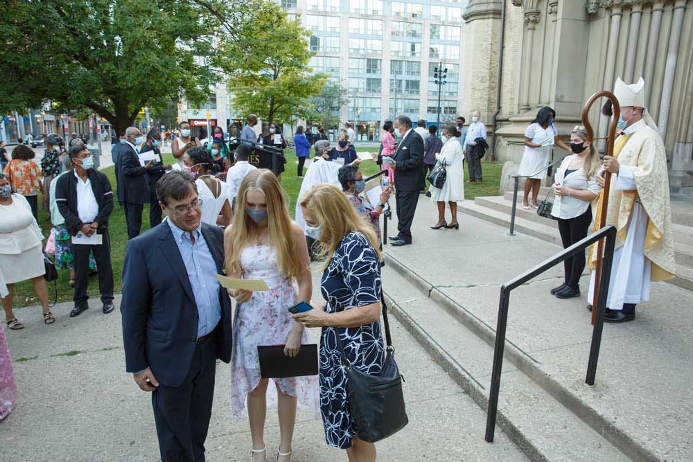 Fifteen people from six parishes are confirmed at the diocesan confirmation service at St. James Cathedral on Sept. 19. Clockwise from top right: confirmands from the parishes of the Church of South India, Toronto, St. Mary Magdalene, St. Paul the Apostle, Rexdale, St. Peter, Erindale, Our Saviour, Toronto, and Emmanuel, Richvale, join Bishop Andrew Asbil, clergy and laity on the cathedral steps after the service.
