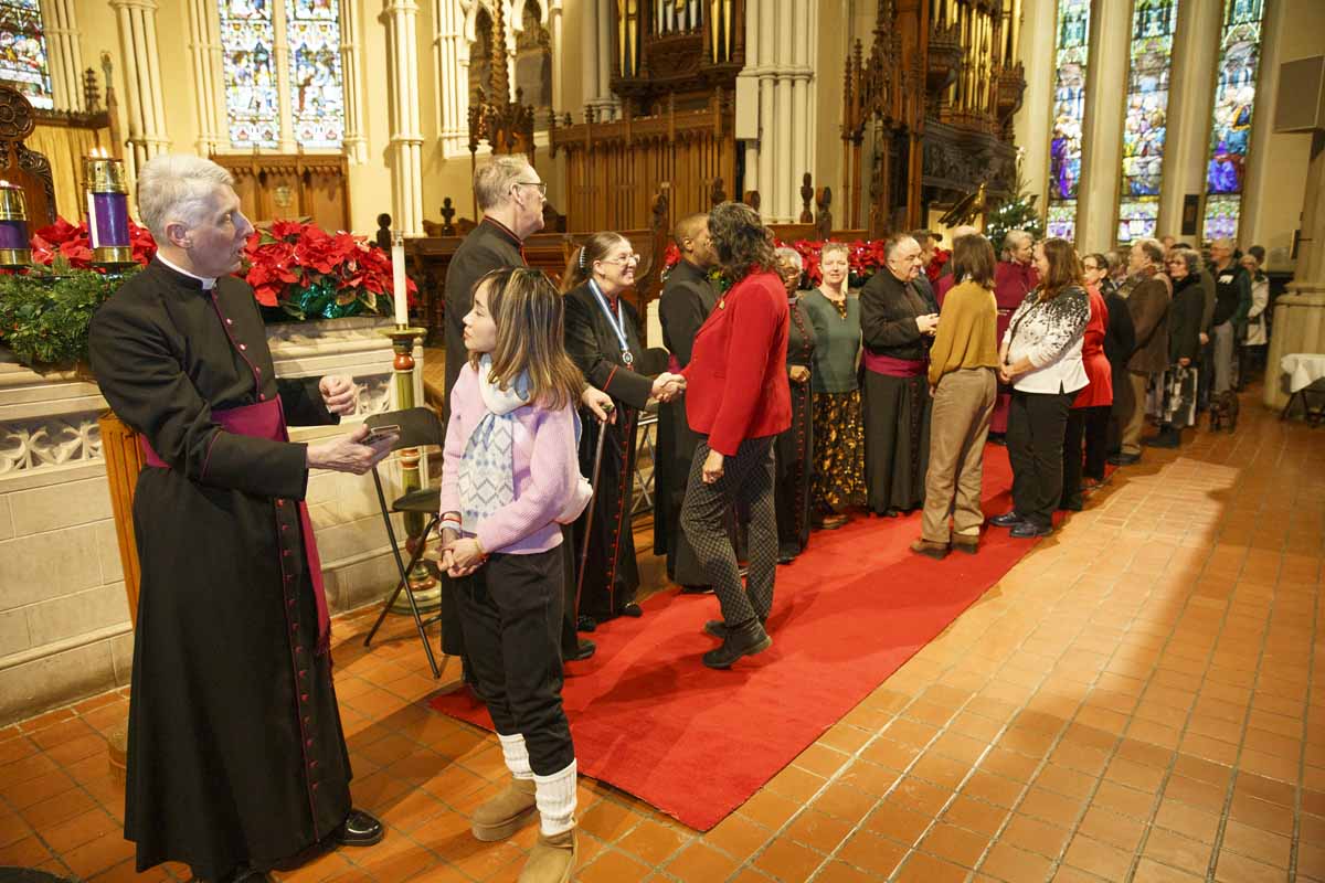 Bishop Andrew and Mary Asbil along with Chancellor Marg Creal exchange New Year’s greetings with friends at the annual Bishop’s Levee, held at St. James Cathedral on Jan. 1. In addition to the receiving line and reception, the afternoon included a Eucharist, festive music and the ringing of the Bells of Old York.