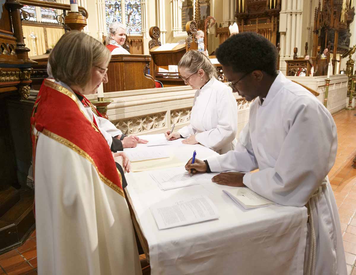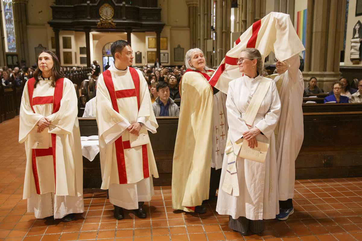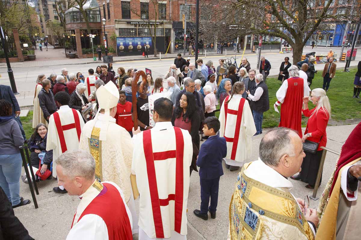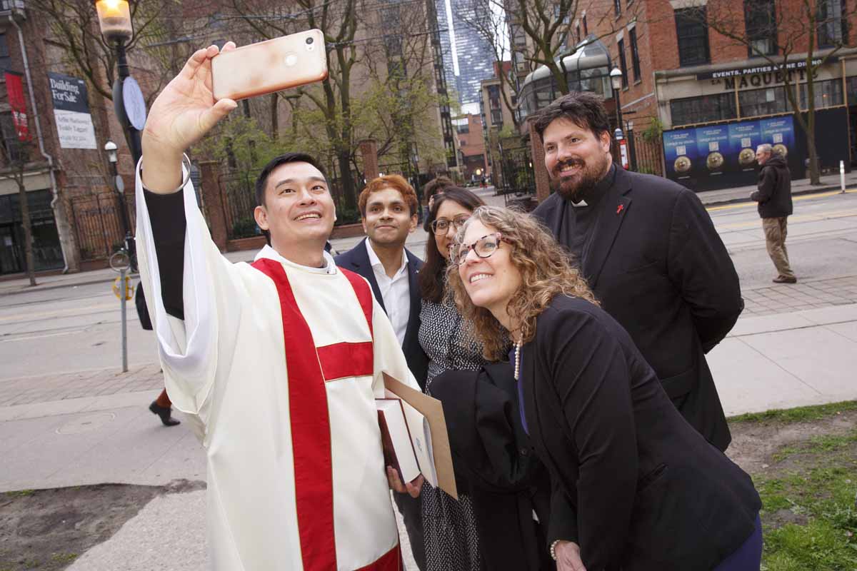 The diocese’s newly ordained transitional deacons stand with Bishop Andrew Asbil, clergy and laity on the steps of St. James Cathedral after their ordination service on May 5. Front row, beginning second from left, are the Rev. Becca Whitla, the Rev. Oliver Lim, the Rev. Mackenzie Wolf, the Rev. Ajith Varghese, the Rev. Amy Pauley and the Rev. Matthew Waterman.