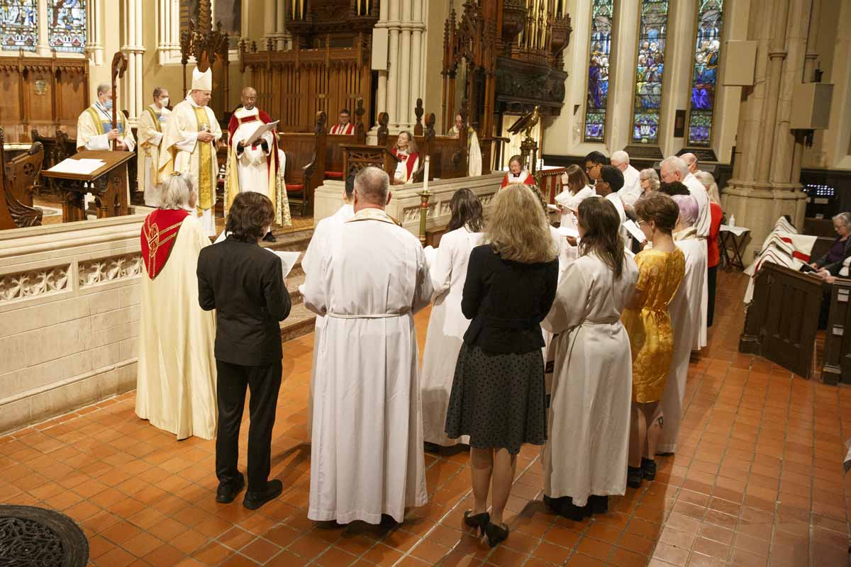 Group shot of new deacons and cathedral clergy outside St. James Cathedral.