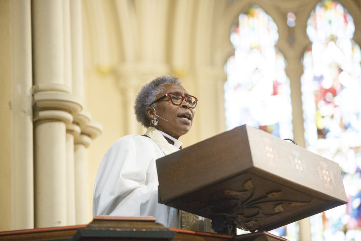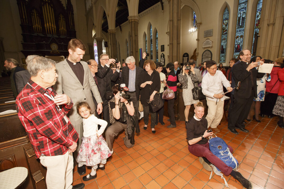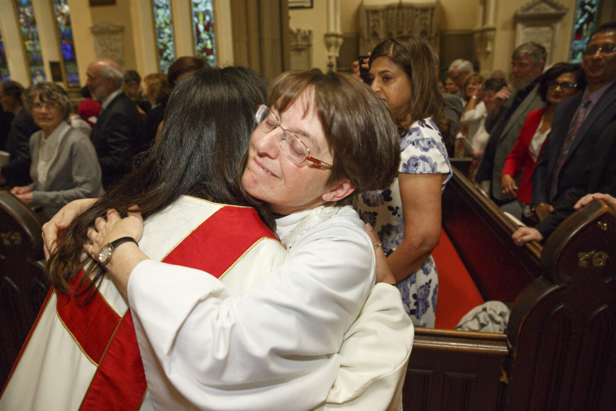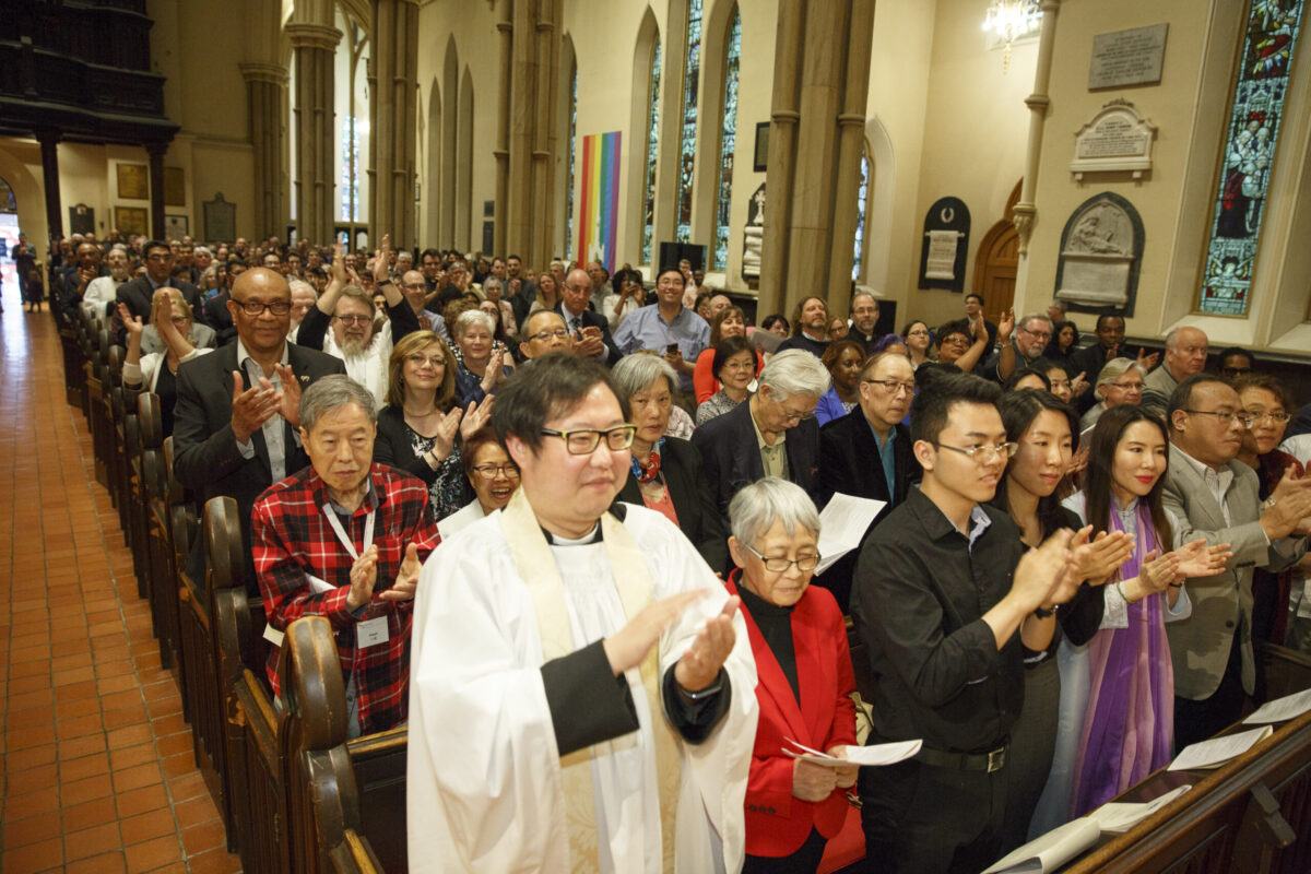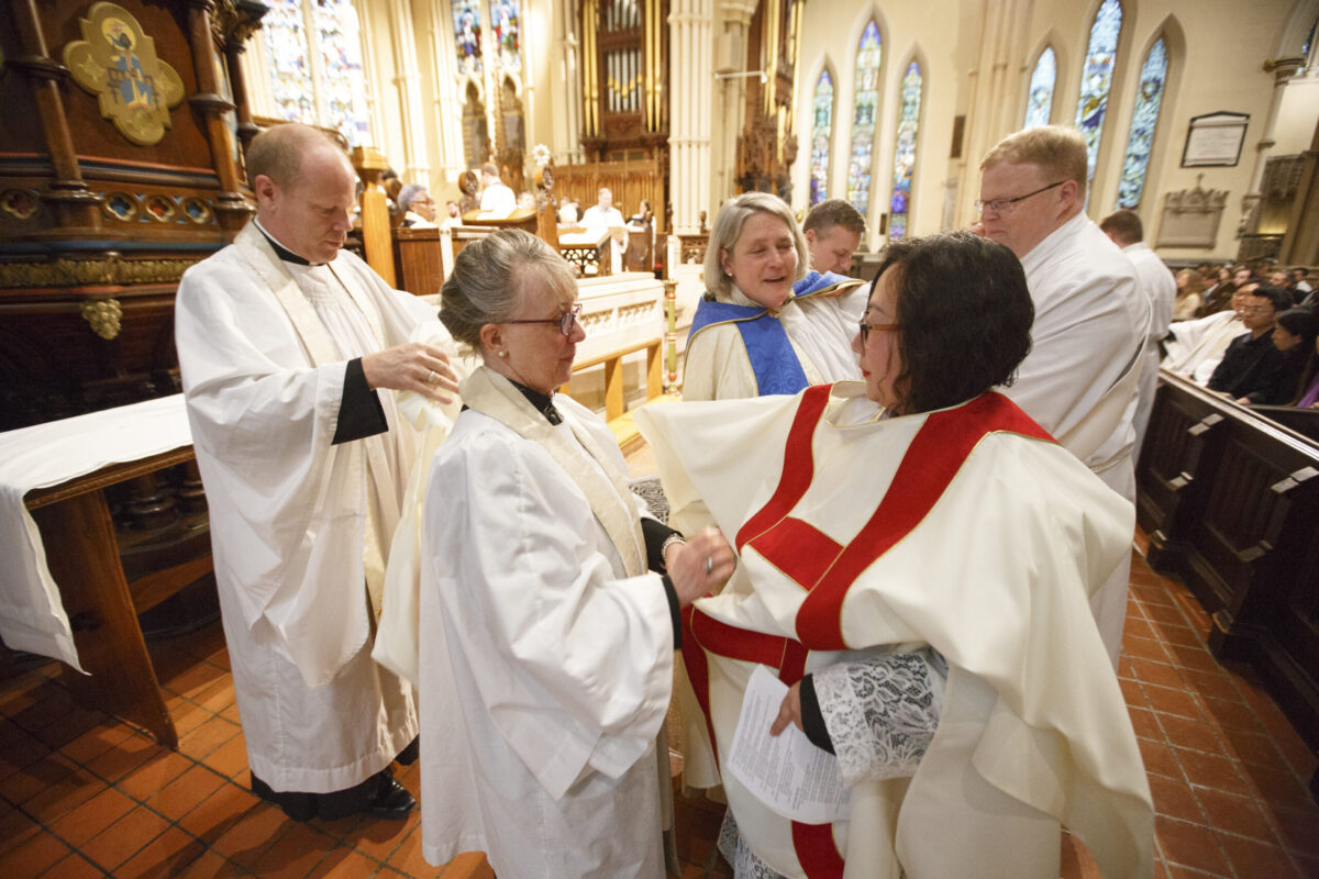 Newly ordained transitional deacons, wearing red and white vestments, stand with Archbishop Colin Johnson, bishops and clergy after their ordination service at St. James Cathedral on May 6. They are, front row from left: the Rev. Morning Wang, the Rev. Johanna Pak, the Rev. Shelly-Ann Pollard and the Rev. Roshni Jayawardena. Second row from left: the Rev. Ken Johnstone, the Rev. Alison Hari-Singh, the Rev. Brian Suggs, the Rev. Andrew Kaye and the Rev. Jeff Boldt.