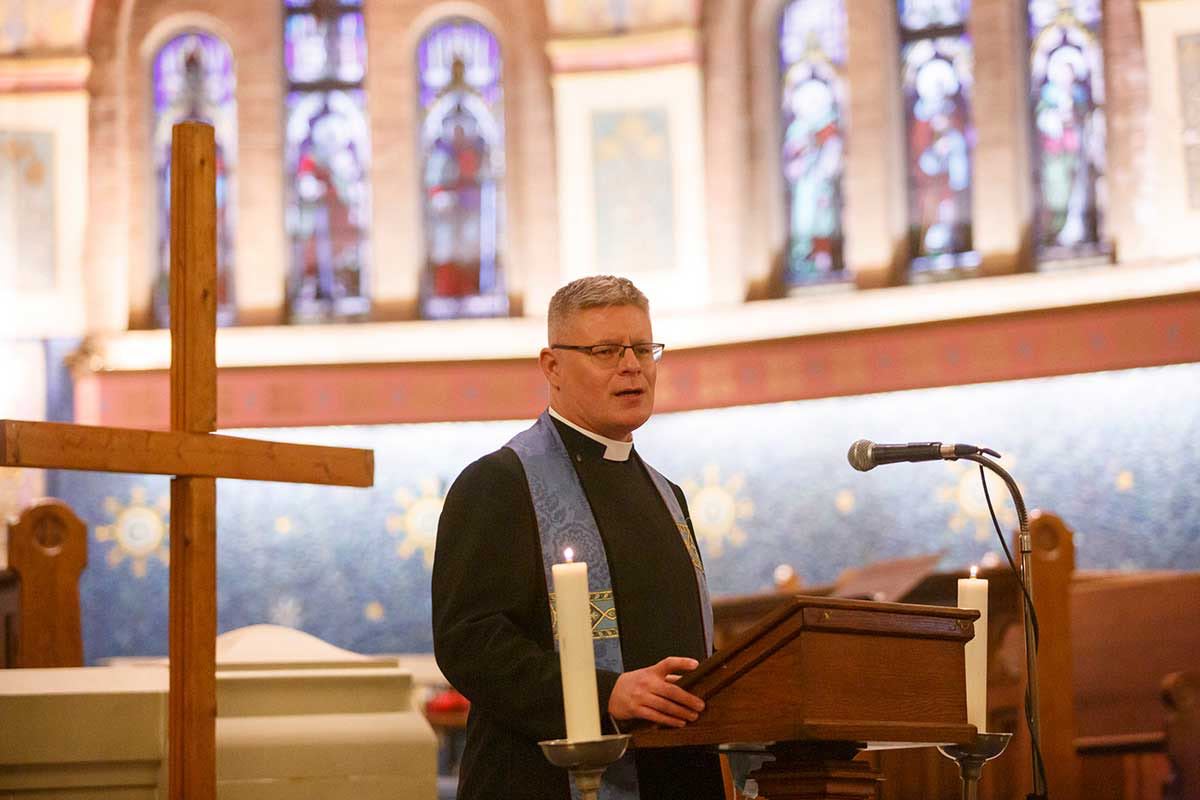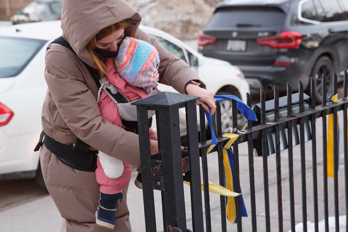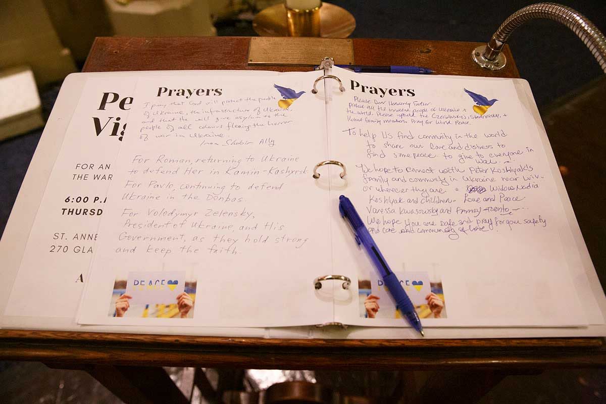 A peace vigil for the end of the war in Ukraine is held at St. Anne, Toronto on March 3. Clockwise from top left: a woman ties a blue and yellow ribbon to the railing outside the church; messages of love and peace; the Rev. Don Beyers welcomes people to the vigil and gives the opening prayer.