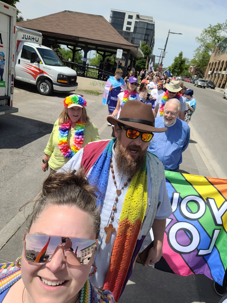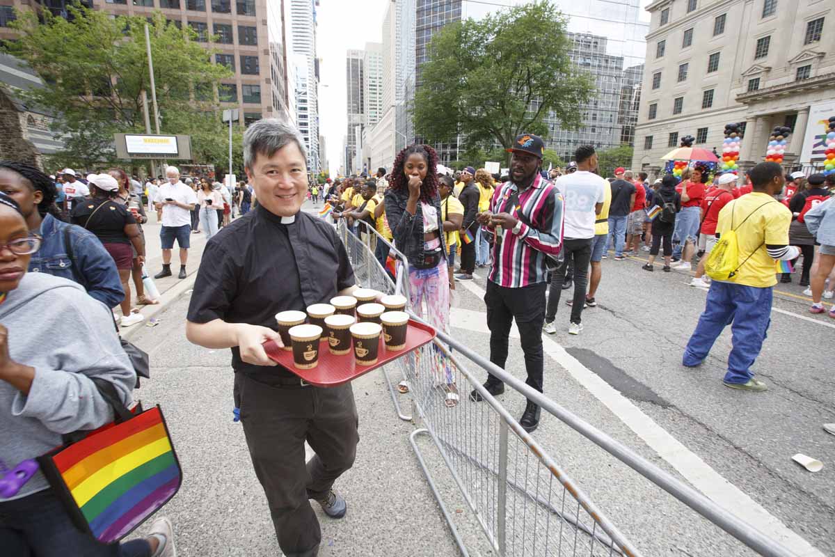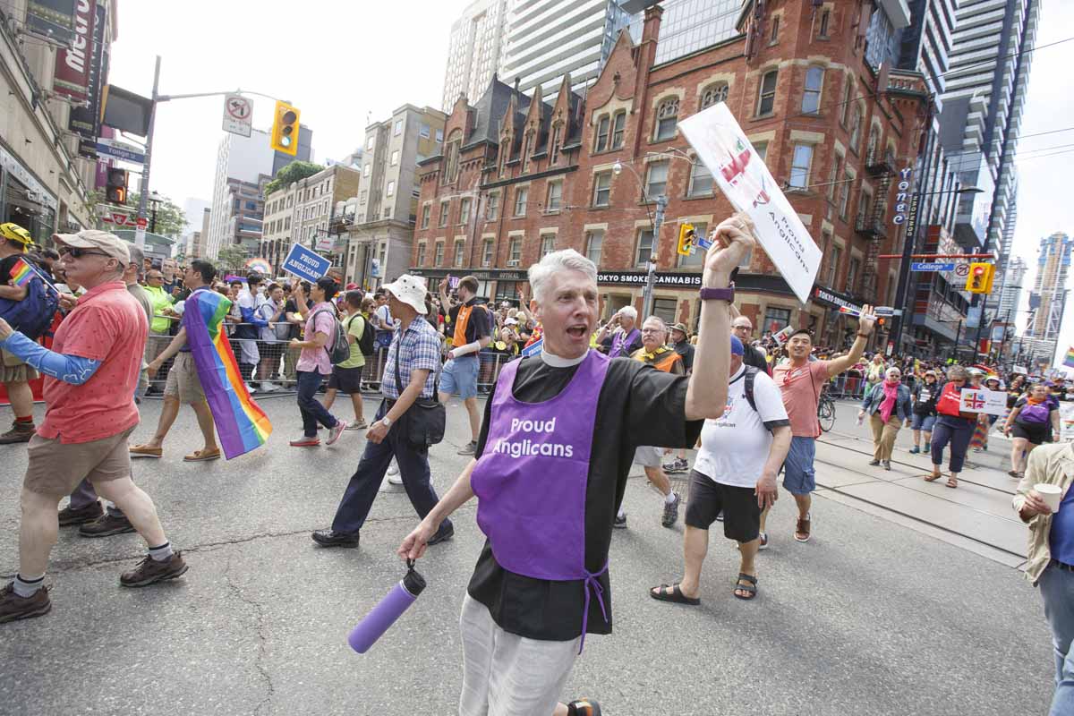 A record 125 Anglicans from 16 parishes walk in the Pride Parade in downtown Toronto on June 30, with tens of thousands of people lining the route. A group from St. Paul, Bloor Street handed out water at the start of the parade.