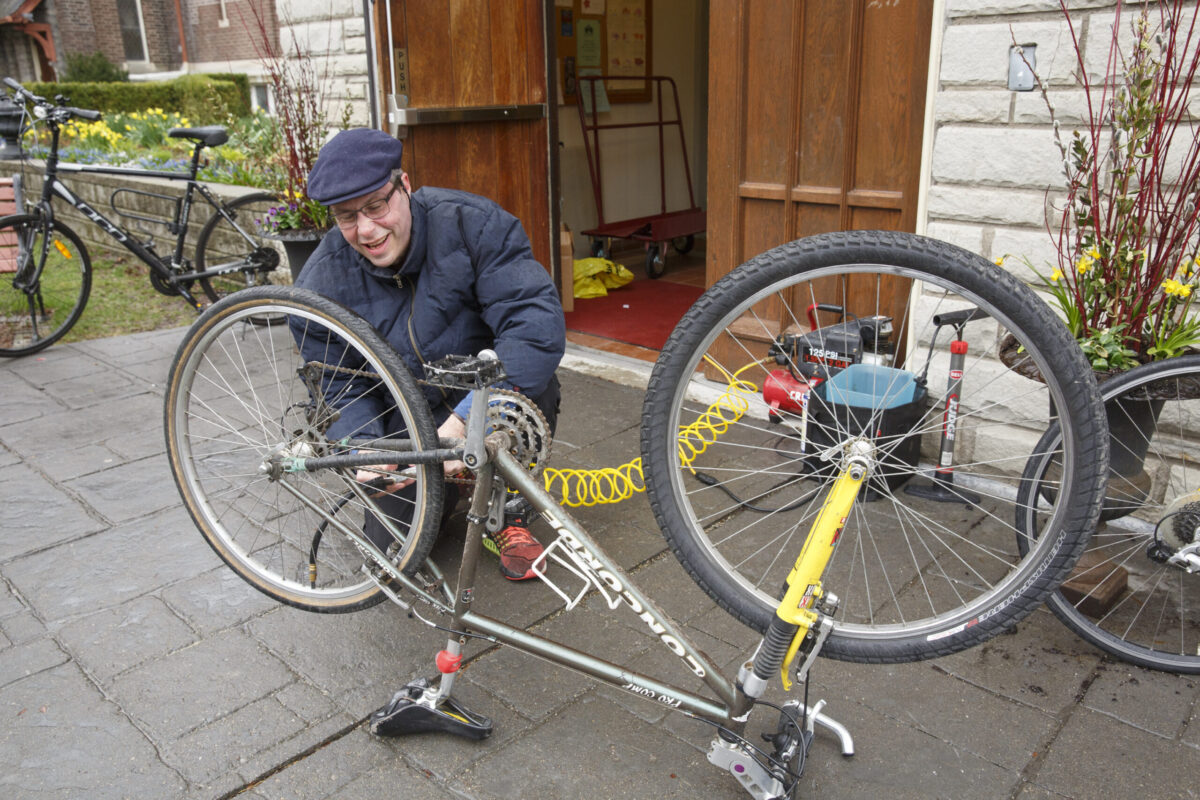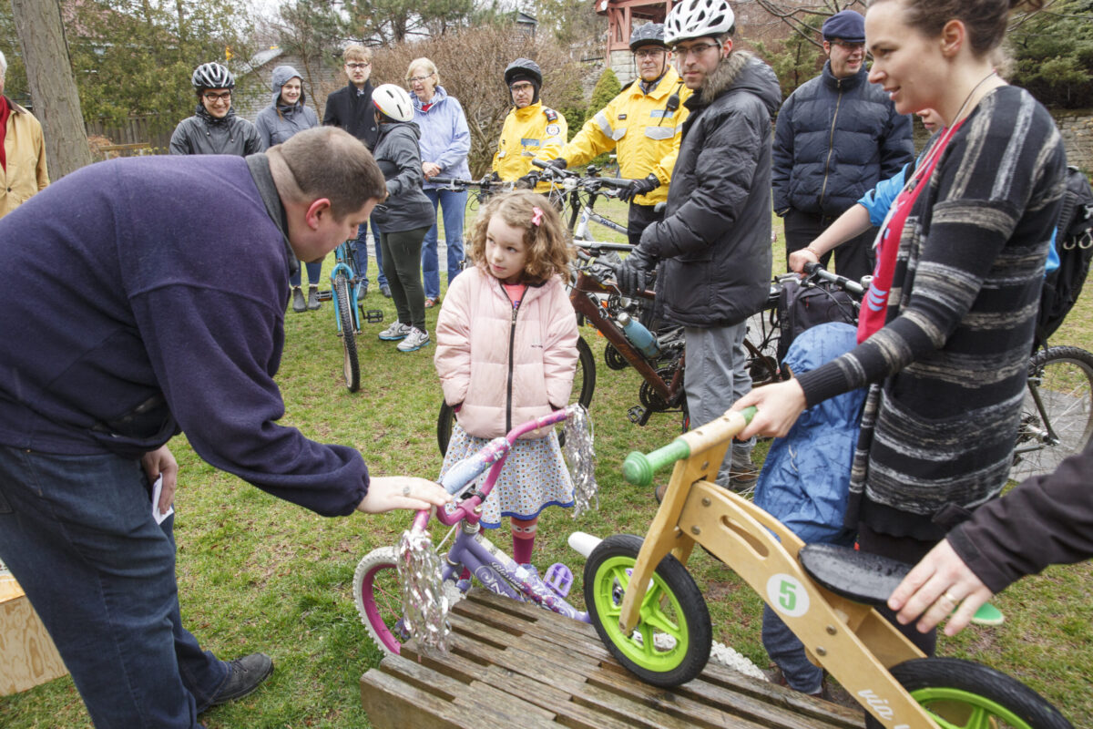 People from the High Park neighbourhood, parishioners and two Toronto auxiliary police officers brought their bikes for the annual Blessing of the Bicycles service.
