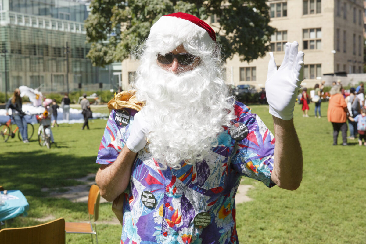 Kids and adults alike enjoyed a “snow cannon” (shooting out environmentally friendly foam), cookie decorating, free ice cream, button making, face painting and games, all to a soundtrack of favourite Christmas carols provided by live musicians. A passport game encouraged participants to get a stamp from each station while answering questions about respites and warming centres in Toronto. Santa Claus could also be spotted wandering around the party, obviously on vacation in a festive tropical shirt.