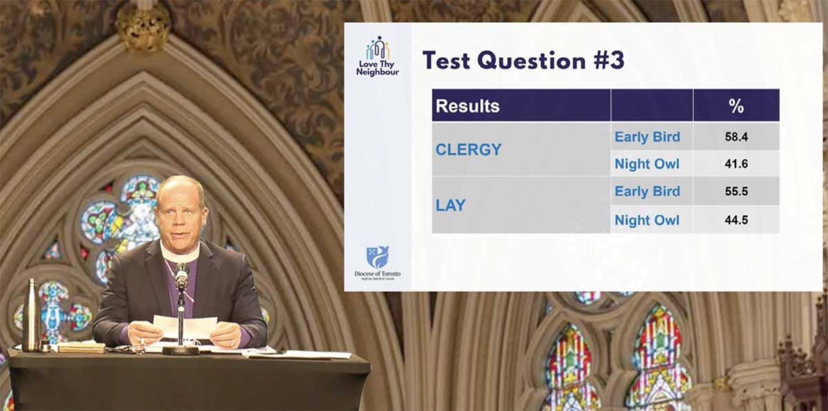 Synod members learned how to vote electronically through the online event platform. They were given instructions and took part in a few test polls to practice. A test vote revealed that a majority of both clergy and lay members considered themselves early birds rather than night owls, to which Bishop Asbil commented “that’s a very Anglican result.”