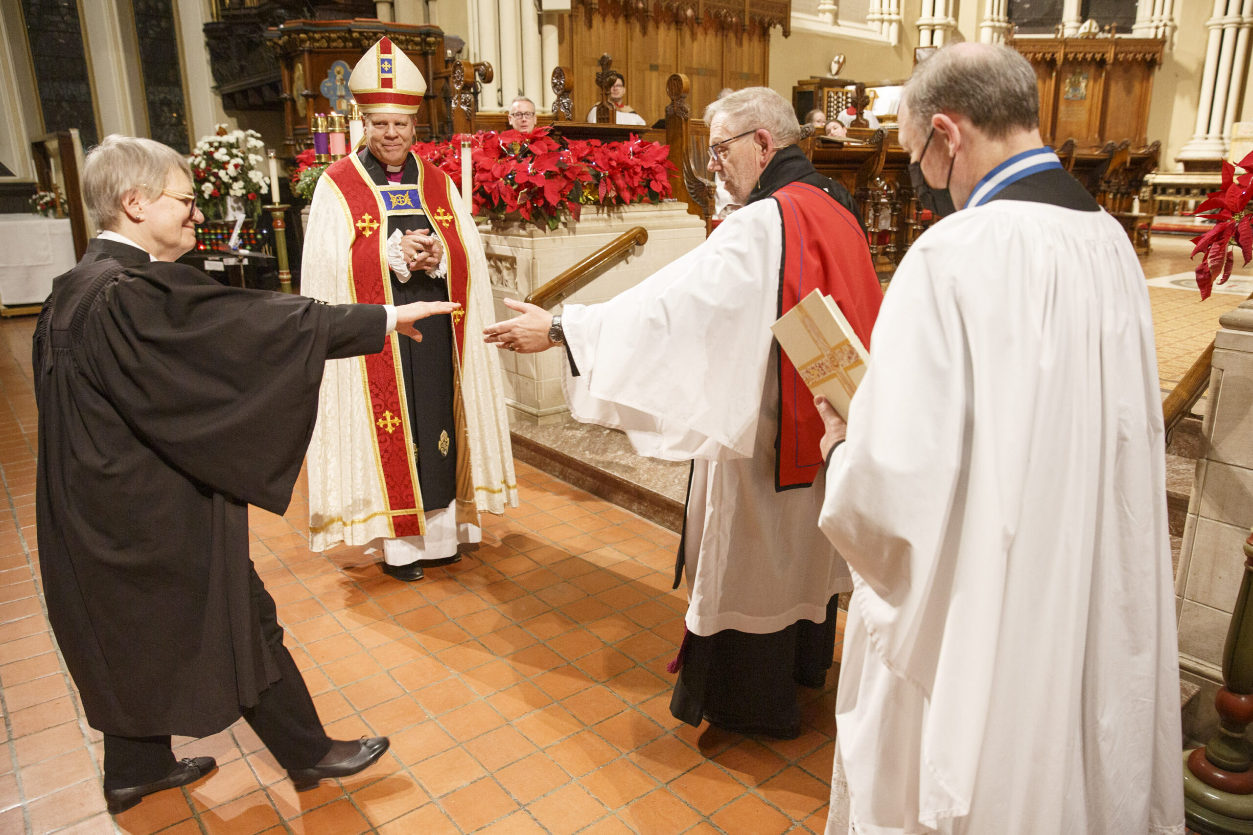 Chancellor Marg Creal receives a welcoming hand by the Very Rev. Peter Wall during her installation at St. James Cathedral on Jan. 1.